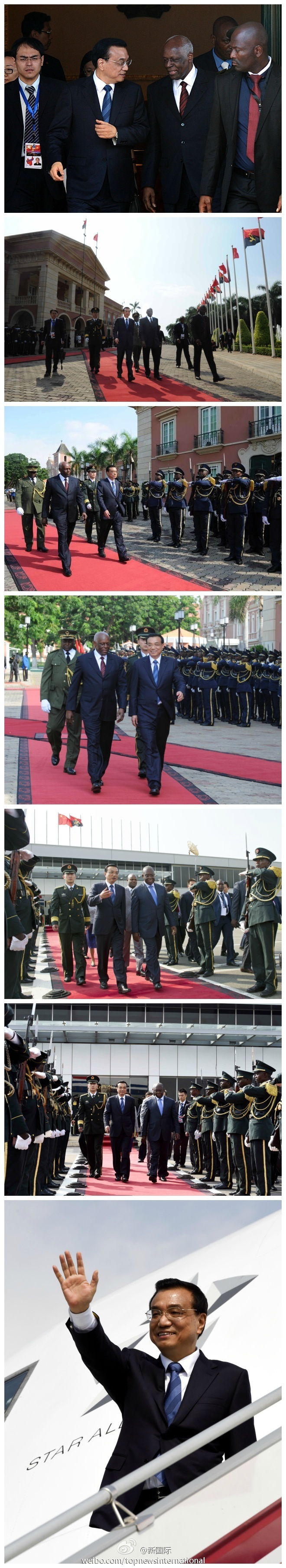 ????新華網(wǎng)北京5月10日電? 據(jù)新華社“新國(guó)際”微博報(bào)道,當(dāng)?shù)貢r(shí)間9日下午,李克強(qiáng)總理結(jié)束了在安哥拉的密集訪問(wèn)行程,安總統(tǒng)多斯桑托斯夫婦在總統(tǒng)府為李克強(qiáng)夫婦舉行歡送儀式,安副總統(tǒng)維森特和外長(zhǎng)??频俚綑C(jī)場(chǎng)為李克強(qiáng)夫婦送行。