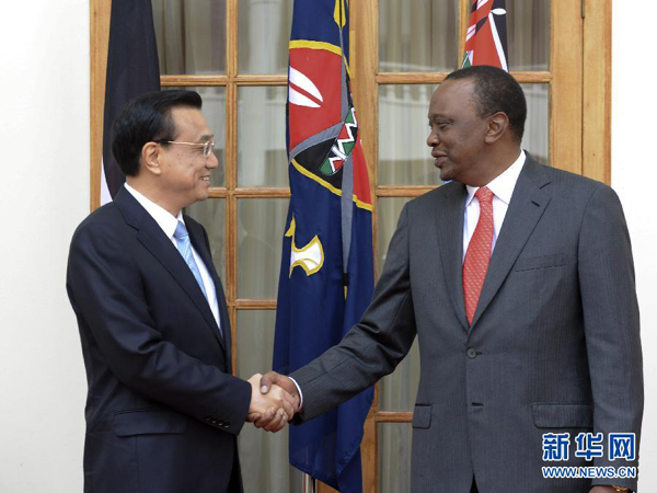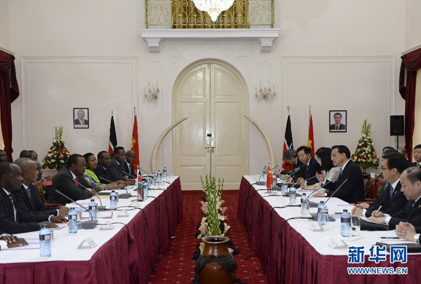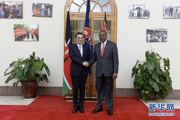 ????肯雅塔代表肯尼亞政府和人民熱烈歡迎李克強(qiáng)訪肯,表示在周恩來(lái)總理訪非50周年之際,李克強(qiáng)總理對(duì)非洲進(jìn)行的里程碑式訪問(wèn)取得圓滿成功,將進(jìn)一步深化非中新型戰(zhàn)略伙伴關(guān)系??现杏兄嗤臍v史遭遇和發(fā)展任務(wù),肯方感謝中方對(duì)肯經(jīng)濟(jì)社會(huì)發(fā)展和保護(hù)生態(tài)環(huán)境、野生動(dòng)物資源的幫助和支持,高度贊賞中國(guó)為維護(hù)非洲和平與發(fā)展作出的重要貢獻(xiàn),完全贊同李克強(qiáng)總理在非盟演講中提出的“461”非中合作框架和在世界經(jīng)濟(jì)論壇非洲峰會(huì)特別致辭中提出的合作建設(shè)非洲基礎(chǔ)設(shè)施“三大網(wǎng)絡(luò)”的主張,愿與中方加強(qiáng)戰(zhàn)略溝通,全面推進(jìn)各領(lǐng)域合作,實(shí)現(xiàn)共同發(fā)展。肯方愿做中國(guó)企業(yè)進(jìn)入非洲的門戶,為推動(dòng)非中合作發(fā)揮積極作用。