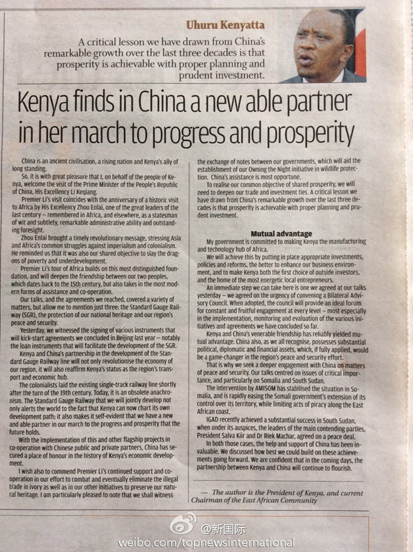 ????新華網(wǎng)北京5月11日電? 據(jù)新華社“新國(guó)際”微博報(bào)道,肯尼亞《旗幟報(bào)》11日發(fā)表肯雅塔總統(tǒng)署名文章《肯將中國(guó)視為發(fā)展繁榮進(jìn)程中的強(qiáng)力伙伴》。文章稱,李克強(qiáng)此訪將進(jìn)一步加深傳統(tǒng)友誼,推動(dòng)雙方新時(shí)期合作。隨著多領(lǐng)域的良好合作,中國(guó)在肯經(jīng)濟(jì)社會(huì)發(fā)展中重要性與日俱增??戏綄?duì)肯中關(guān)系未來充滿信心。