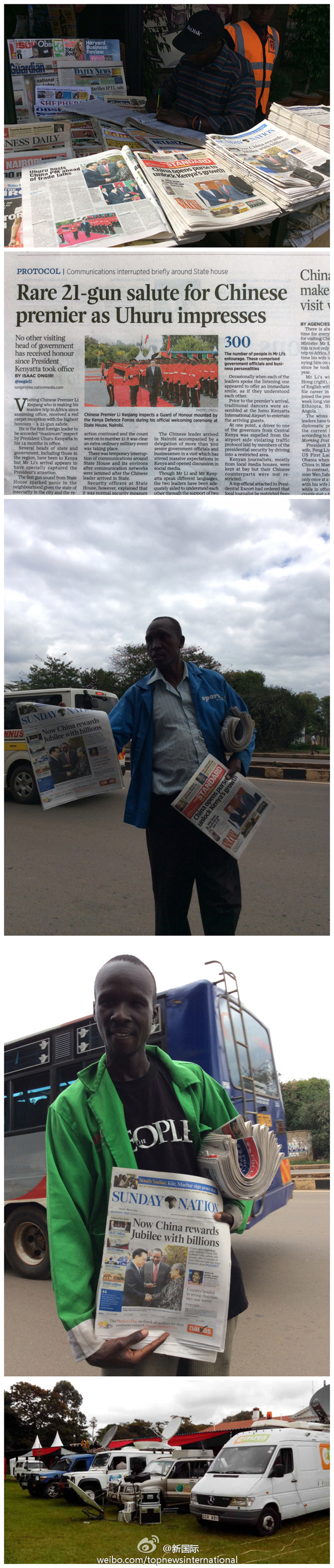 ????新華網(wǎng)北京5月11日電? 據(jù)新華社“新國際”微博報道,連日來,肯尼亞各大媒體紛紛對李克強(qiáng)總理訪肯進(jìn)行全方位報道。主要報紙均在頭版頭條大篇幅介紹訪問情況,并開辟專版引述李總理講話對肯中關(guān)系進(jìn)行述評??先箅娨暸_現(xiàn)場直播李總理和肯雅塔總統(tǒng)會見記者實況。肯媒體還高度評價中國在文化教育等領(lǐng)域的軟實力外交。