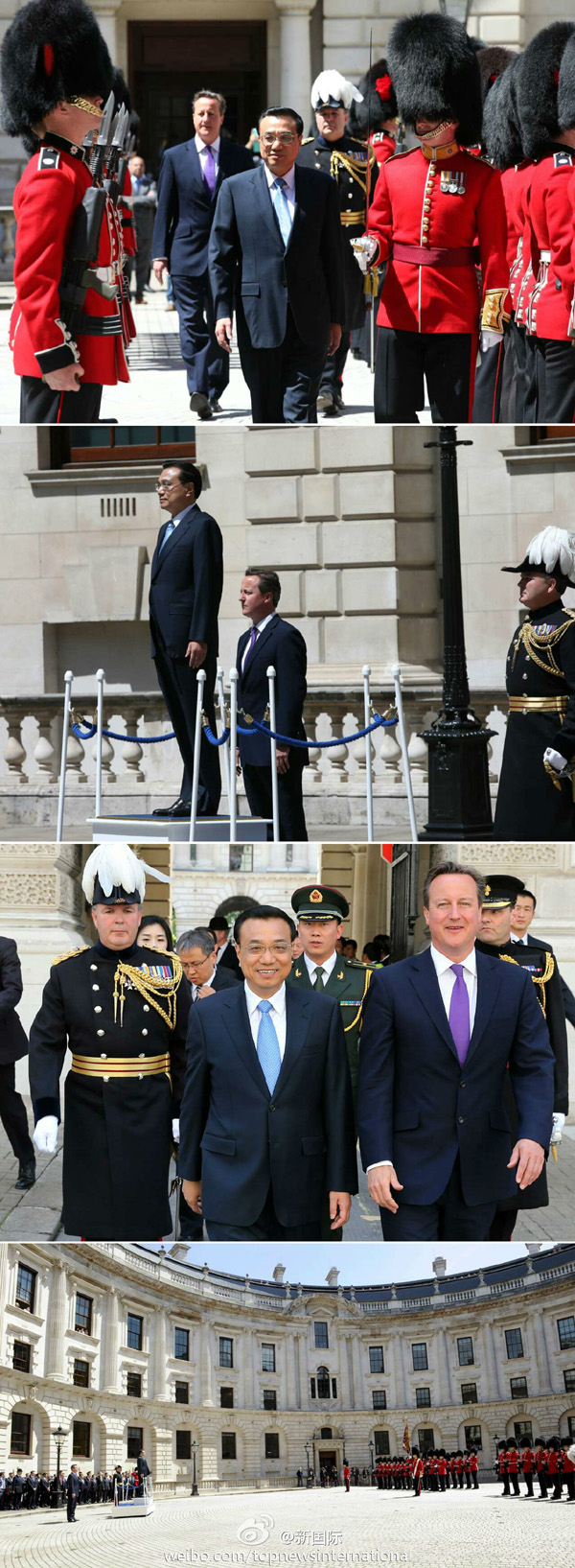 新華網(wǎng)北京6月17日電 據(jù)新華社“新國際”微博報道,當?shù)貢r間17日中午,英國首相卡梅倫在英國財政部庭院內(nèi)為李克強總理舉行隆重的歡迎儀式。軍樂隊奏中英兩國國歌。李克強在卡梅倫的陪同下檢閱了儀仗隊。