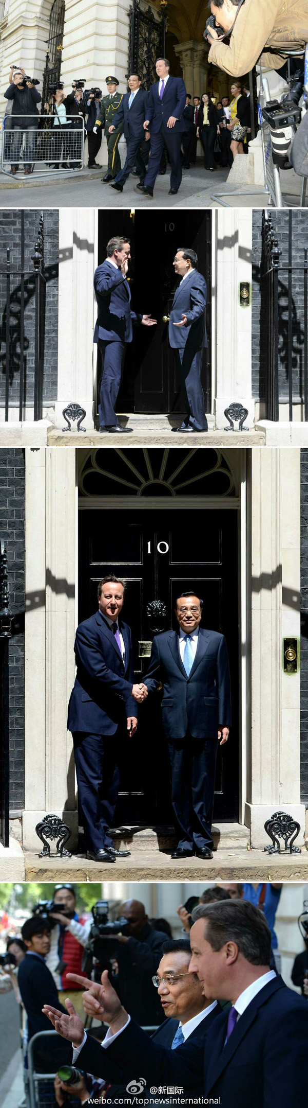 新華網(wǎng)北京6月17日電 據(jù)新華社“新國際”微博報道,17日,英國首相府所在的唐寧街附近五星紅旗飄揚(yáng),卡梅倫為到訪的李克強(qiáng)總理舉行隆重歡迎儀式。隨后,兩位領(lǐng)導(dǎo)人步行來到首相官邸。面對中外記者的鏡頭,李克強(qiáng)與卡梅倫握手合影,愉快交談。在首相府一層內(nèi)閣會議室內(nèi),兩位領(lǐng)導(dǎo)人就雙邊關(guān)系和共同關(guān)心的問題舉行會談。