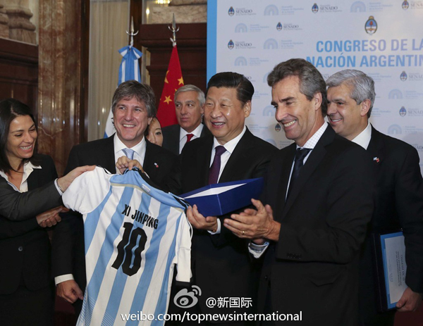 ????新華網(wǎng)北京7月20電 據(jù)新華社“新國際”微博報道,正在阿根廷進行國事訪問的國家主席習近平當?shù)貢r間19日上午會見了副總統(tǒng)兼參議長布杜和眾議長多明格斯。會見后,布杜向習近平主席贈送了阿根廷國家足球隊10號球衣。在剛結(jié)束的世界杯比賽中,阿根廷國家隊10號球員為梅西。