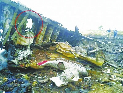 從這張殘骸照片來看,機(jī)身上有比臉盆略大的孔洞,破壞方向從機(jī)體外部沖向內(nèi)部,懷疑是導(dǎo)彈的戰(zhàn)斗部碎片擊中的一塊區(qū)域。