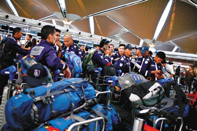 當?shù)貢r間7月18日,馬來西亞國際機場,馬來西亞派特殊救災(zāi)和救援小組成員前往MH17墜機事故現(xiàn)場。圖/CFP