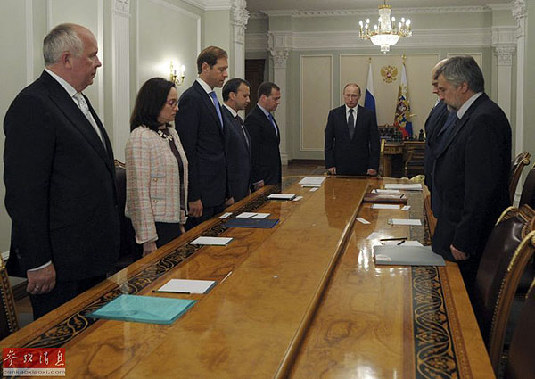 7月17日夜,在俄羅斯莫斯科州新奧加廖沃官邸,俄羅斯總統(tǒng)普京(后)和一些高級別官員在經(jīng)濟問題會議前為墜毀馬航MH17航班的遇難者默哀。普京當晚說,馬航客機失事悲劇發(fā)生在烏克蘭領空,烏克蘭無疑對此承擔責任。