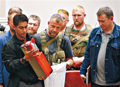 “頓涅茨克人民共和國”總理博羅代22日凌晨舉行新聞發(fā)布會,把黑匣子交給馬來西亞方面。一名武裝人員把兩個橙色黑匣子放在桌上。馬來西亞專家代表團與烏克蘭民間武裝代表簽署一份協(xié)議后,烏民間武裝把黑匣子交給馬方。