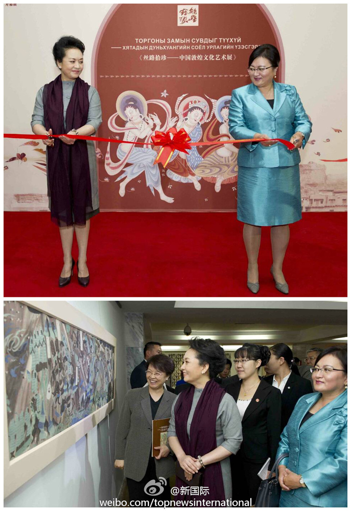 ???? 新華網(wǎng)北京8月22日電 據(jù)新華社“新國際”微博報(bào)道,習(xí)近平主席夫人彭麗媛和額勒貝格道爾吉總統(tǒng)夫人包勒爾瑪22日上午共同出席為慶祝中蒙建交65周年暨“中蒙友好交流年”舉行的中國文化周開幕式并剪彩,欣賞蒙古國藝術(shù)家的精彩演出,并參觀中國敦煌文化藝術(shù)展,觀賞臨摹的敦煌石窟壁畫、復(fù)制泥塑和樂器。