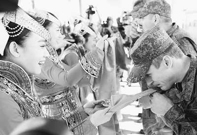 2014年8月16日,在內(nèi)蒙古自治區(qū)朱日和訓(xùn)練基地火車站,來(lái)自俄羅斯的參演實(shí)兵部隊(duì)官兵在歡迎儀式上接受蒙古族傳統(tǒng)迎賓禮。