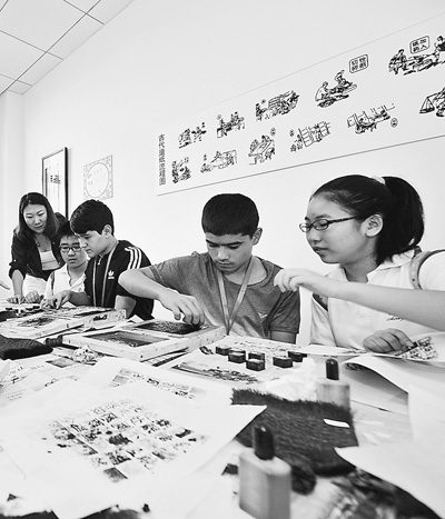 2014年8月14日,上合組織成員國(guó)首批中學(xué)生交流夏令營(yíng)來(lái)到天津。圖為來(lái)自塔吉克斯坦的中學(xué)生與中國(guó)學(xué)生一起體驗(yàn)活字印刷術(shù)。