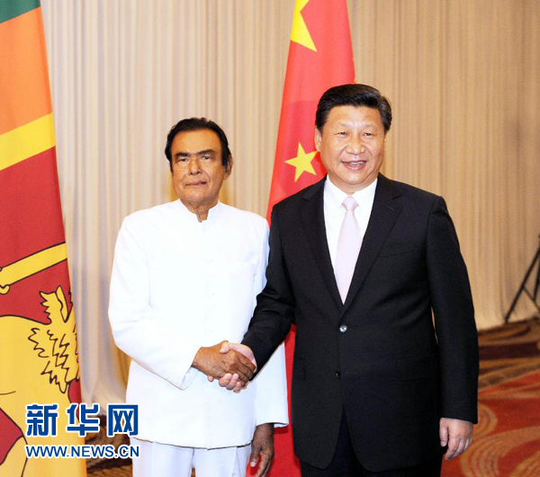 ????習近平贊賞賈亞拉特納長期致力于推動中斯關(guān)系發(fā)展,是中斯友誼的見證者和推動者。習近平指出,昨天我同拉賈帕克薩總統(tǒng)進行了富有成果的會談,就深化雙邊關(guān)系達成廣泛共識,對中斯關(guān)系未來發(fā)展作出規(guī)劃,雙方要扎扎實實推進,一件一件落實。雙方要加快推進中斯自由貿(mào)易談判,穩(wěn)步推進漢班托塔港等大項目合作,拓展旅游、海洋科研、海洋經(jīng)濟、港口建設(shè)、海上安全等領(lǐng)域合作,共同推進21世紀海上絲綢之路建設(shè),加強旅游合作,促進兩國人員交往。雙方要加強多邊領(lǐng)域合作,中方歡迎斯方作為創(chuàng)始成員國參與籌建亞洲基礎(chǔ)設(shè)施投資銀行。