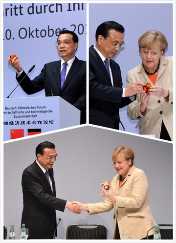 ????李總理說,這是訪前天津中德職業(yè)技術(shù)學(xué)院師生共同創(chuàng)作的作品,希望我送給默克爾總理。解開魯班鎖是解決一道難題,相信中德之間的合作能不斷創(chuàng)新,共同破解世界性難題,開啟美好的未來。