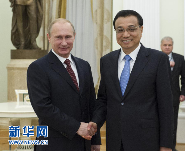 10月14日,國(guó)務(wù)院總理李克強(qiáng)在莫斯科克里姆林宮會(huì)見(jiàn)俄羅斯總統(tǒng)普京。 新華社記者 饒愛(ài)民 攝