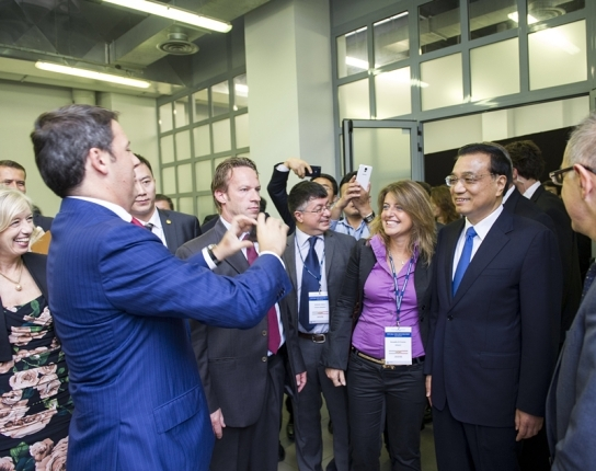 今天的活動(dòng)中,克強(qiáng)總理結(jié)束致辭離開會(huì)場時(shí),正好從董柔心身旁走過。她抓住時(shí)機(jī),用中文同克強(qiáng)總理打招呼。這招也成功地引起了克強(qiáng)總理的注意??藦?qiáng)總理不僅夸她中文說得不錯(cuò),還欣然應(yīng)允了合影的要求。一旁的倫齊連忙“貼心地”拿過董柔心的手機(jī),幫他倆拍下了合影。