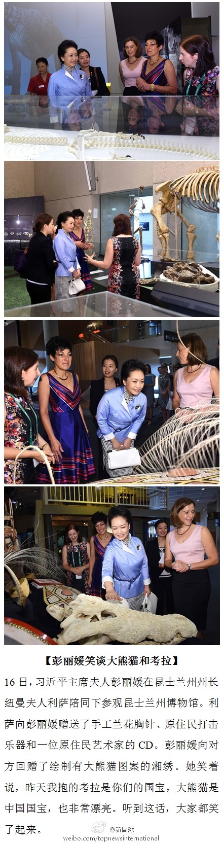 ????新華網(wǎng)北京11月16日電 據(jù)新華社“新國際”微博報道,16日,習(xí)近平主席夫人彭麗媛在澳大利亞昆士蘭州州長紐曼夫人利薩陪同下參觀昆士蘭州博物館。