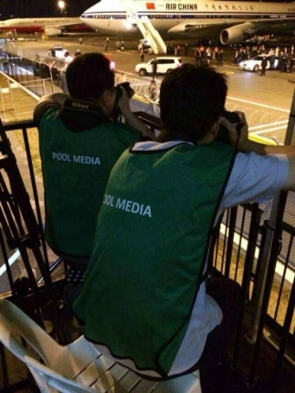 ??? 習(xí)近平主席的專機(jī),降落在布里斯班,已經(jīng)是當(dāng)?shù)貢r間14日晚上9點(diǎn)50左右,話說布里斯班白天驕陽灼人,太陽一落山氣溫蹭蹭下降,等候?qū)C(jī)抵達(dá)的記者要是沒加件外套,就只能挨凍啦!