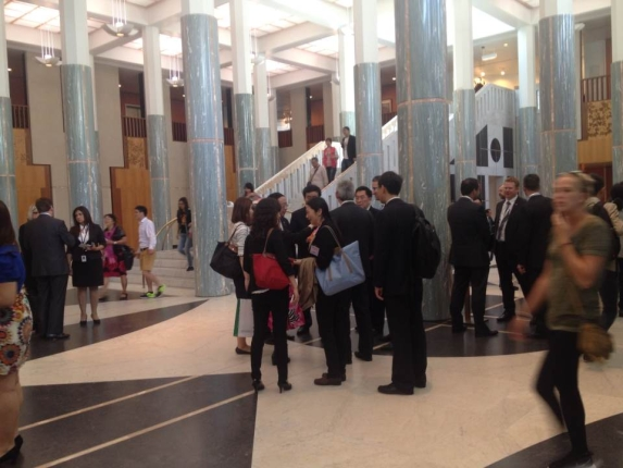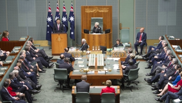 ????這次在澳大利亞,“掌聲響起來”的地方,是堪培拉的標(biāo)志性建筑——澳聯(lián)邦參眾兩院所在議會大廈的眾議院會議廳。演講的聽眾?自然主要是議員先生和女士們啦,還有陪同出席演講的阿博特總理、帕里參議長、工黨領(lǐng)袖肖滕,以及主持人畢曉普眾議長。