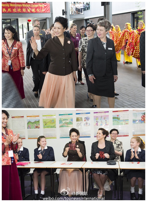 ??? 新華網(wǎng)北京11月19日電 據(jù)新華社“新國際”微博報道,習(xí)近平主席夫人彭麗媛19日在悉尼參觀育文武女子學(xué)校,在舞龍隊引導(dǎo)下來到孔子課堂?!鞍兹找郎奖M……”16名女孩朗誦《登鸛雀樓》,還學(xué)打中國結(jié)、制作剪紙、繡織漢字“中澳友誼長存”。彭麗媛拿起剪刀,剪出一個“?!弊?。?