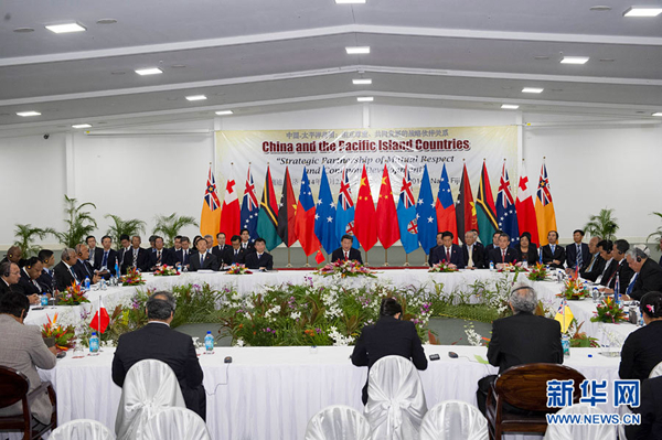 ???? 11月22日,國家主席習近平在楠迪同斐濟總理姆拜尼馬拉馬、密克羅尼西亞聯(lián)邦總統(tǒng)莫里、薩摩亞總理圖伊拉埃帕、巴布亞新幾內亞總理奧尼爾、瓦努阿圖總理納圖曼、庫克群島總理普納、湯加首相圖伊瓦卡諾、紐??偫硭忍窖髰u國領導人舉行集體會晤。習近平主持會議并發(fā)表主旨講話。新華社記者 饒愛民攝