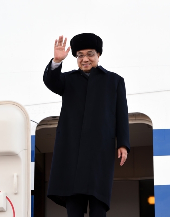 專(zhuān)機(jī)艙門(mén)打開(kāi),克強(qiáng)總理身著大衣,頭戴皮帽,一邊走下舷梯一邊向大家揮手致意。