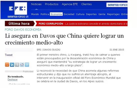 22日,西班牙埃菲社報(bào)道了李克強(qiáng)總理在達(dá)沃斯世界經(jīng)濟(jì)論壇上的致辭,特別提到他就中國經(jīng)濟(jì)增速放緩的回應(yīng)。報(bào)道中引用李克強(qiáng)總理的話:“中國經(jīng)濟(jì)進(jìn)入新常態(tài),經(jīng)濟(jì)由高速增長轉(zhuǎn)為中高速增長。發(fā)展則必須由中低端水平邁向中高端水平,為此要堅(jiān)定不移地推動(dòng)結(jié)構(gòu)性改革?!?/p>
