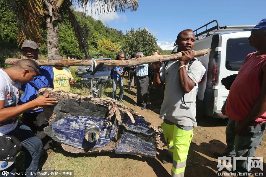 當(dāng)?shù)貢r(shí)間2015年8月11日,法屬留尼汪島,當(dāng)?shù)厮丫汝?duì)獲得的馬航MH370殘骸。
