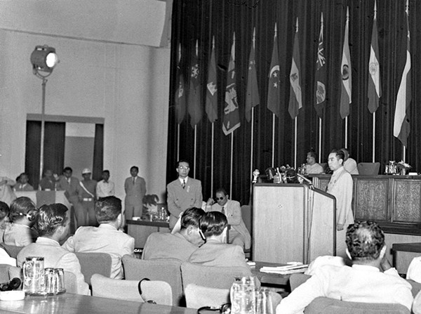 1955年4月18日至24日,在印度尼西亞萬隆舉行首屆亞非會議,即萬隆會議。中國代表團(tuán)團(tuán)長周恩來總理在大會上發(fā)言。(資料照片)