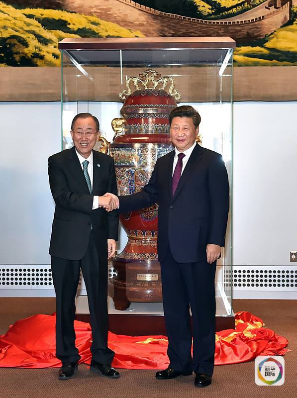 習近平出席中國向聯(lián)合國贈送“和平尊”儀式。新華社記者李濤攝