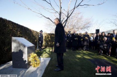 資料圖:當?shù)貢r間2015年7月17日,澳大利亞堪培拉,馬航MH17空難一周年之際,國會大廈外舉行馬航MH17遇難者紀念碑揭幕儀式,澳大利亞總理托尼·阿博特攜妻子向紀念碑獻花。2014年7月17日,載有298人的馬航MH17客機在靠近俄羅斯邊界的烏克蘭頓涅茨克地區(qū)墜毀,機上乘客與機組成員全部遇難。
