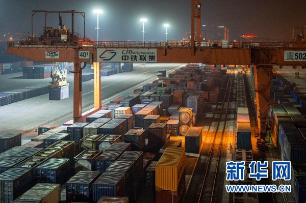 10月15日凌晨,在重慶鐵路口岸中鐵聯(lián)集重慶集裝箱中心站的作業(yè)區(qū),幾臺大型門吊在緊張地作業(yè),為第1000列中歐班列裝載出口到歐洲的貨物。當(dāng)日11時45分,載著筆記本電腦等51個集裝箱貨物的中歐班列,緩緩駛出重慶團(tuán)結(jié)村站,駛向1.1萬公里之外的德國杜伊斯堡。這是第1000列往來中國和歐洲之間的國際貨運列車。新華社記者劉潺攝