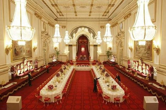 36.6米長、18米寬、13.5米高的宴會廳(the Ballroom)是白金漢宮最大的房間,女王招待國外元首的國宴都在這里舉行。國宴一般由四道菜組成,白金漢宮的廚房可以同時供應(yīng)600位賓客一起用餐。