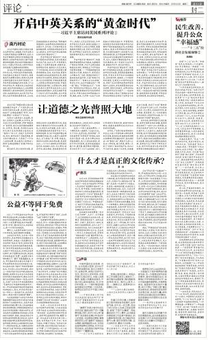 英國駐華大使吳百納連續(xù)用了四個(gè)“黃金”來形容習(xí)近平主席此次訪英的意義:“今年是中英關(guān)系的黃金年,這將是一次黃金訪問,它證明中英關(guān)系的發(fā)展處于黃金時(shí)期。訪問將確立中英面向21世紀(jì)的全球伙伴關(guān)系,開啟中英關(guān)系史上的黃金10年?!蔽覀兤诖⑾嘈?,這次為開啟中英關(guān)系“黃金時(shí)代”而往的里程碑式訪問,一定能成功打造中英關(guān)系新格局、繪制兩國關(guān)系新藍(lán)圖、開辟務(wù)實(shí)合作新前景、樹立國際合作新典范。(南方日?qǐng)?bào)評(píng)論員)