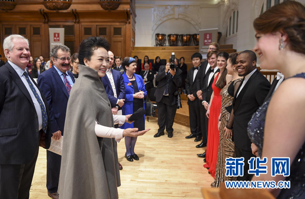 彭麗媛抵達(dá)時(shí),受到皇家音樂(lè)學(xué)院董事會(huì)主席溫斯頓勛爵、學(xué)院院長(zhǎng)、英國(guó)友人等熱烈歡迎。在院長(zhǎng)陪同下,彭麗媛欣賞了獲獎(jiǎng)學(xué)生和校友精彩的聲樂(lè)、器樂(lè)表演,參觀了樂(lè)器博物館,觀賞了圖書(shū)館珍藏的莫扎特、肖邦等音樂(lè)大師創(chuàng)作手稿,并同學(xué)院師生進(jìn)行交流。彭麗媛表示,音樂(lè)作為一種高尚的藝術(shù)形式,超越國(guó)家、民族、歷史、文化界限。皇家音樂(lè)學(xué)院培養(yǎng)出眾多世界級(jí)藝術(shù)家。中國(guó)有不少音樂(lè)作品享譽(yù)世界,希望皇家音樂(lè)學(xué)院今后加強(qiáng)同中國(guó)音樂(lè)院校的交流,為促進(jìn)中英教育和藝術(shù)合作貢獻(xiàn)力量。