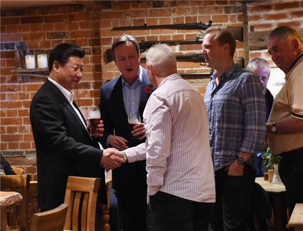 10月22日,國家主席習(xí)近平在契克斯首相鄉(xiāng)間別墅同英國首相卡梅倫再次會晤。會晤結(jié)束后,習(xí)近平在卡梅倫陪同下乘車前往當(dāng)?shù)匦℃?zhèn)體驗(yàn)酒吧文化。(新華社記者饒愛民攝)