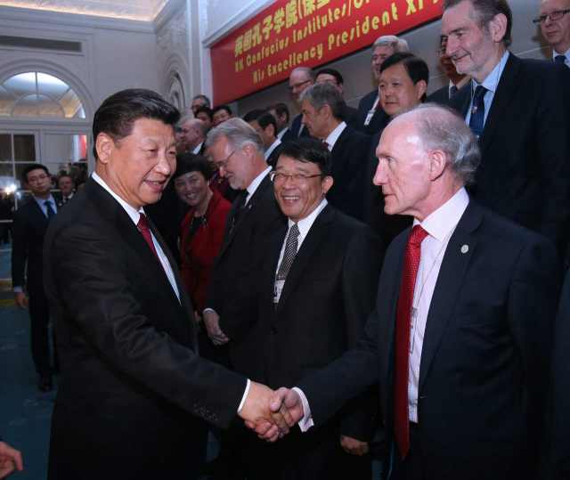 習(xí)近平指出,近年來,孔子學(xué)院在英國快速發(fā)展。目前,英國已經(jīng)建立起29所孔子學(xué)院和126個(gè)孔子課堂,數(shù)量居歐洲之首。全英孔子學(xué)院取得的碩果也是中英人文交流蓬勃發(fā)展的縮影。通過人文交流,中英兩國文化中的精華正在對(duì)兩國人民的思維方式和生活方式產(chǎn)生著奇妙的“化學(xué)反應(yīng)”?!盀橹粎?,誨人不倦?!毕M谧魑唤處熢俳釉賲枺瑸橹杏⒂押檬聵I(yè)添磚加瓦。希望孔子學(xué)院繼續(xù)秉承“相互尊重、友好協(xié)商、平等互利”的校訓(xùn),為傳播文化、溝通心靈、促進(jìn)世界文明多樣性作出新的更大貢獻(xiàn)。