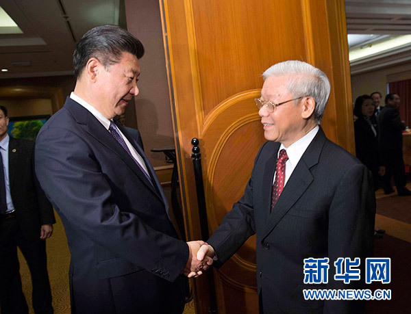 阮富仲向習近平介紹了越南革新事業(yè)取得的成績和越共十二大籌備情況。阮富仲表示,越方高度重視新形勢下黨建工作,關(guān)注中方黨建和發(fā)展社會主義經(jīng)驗,愿同中方加強交流合作,互學互鑒。越方贊同兩國增進各領(lǐng)域交流合作。