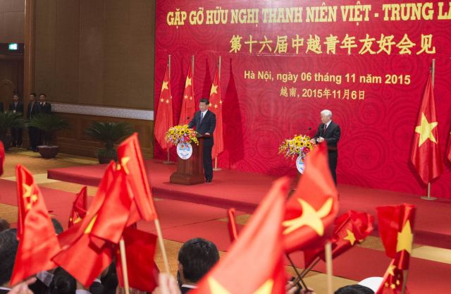 11月6日,中共中央總書記、國(guó)家主席習(xí)近平和越共中央總書記阮富仲在河內(nèi)共同會(huì)見參加第十六屆中越青年友好會(huì)見活動(dòng)的中越青年代表。新華社記者李學(xué)仁攝