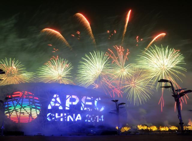 2014年11月10日,北京在奧林匹克公園舉行焰火表演。APEC第二十二次領(lǐng)導(dǎo)人非正式會議2014年11月10日至11日在北京舉行。新華社記者羅曉光攝