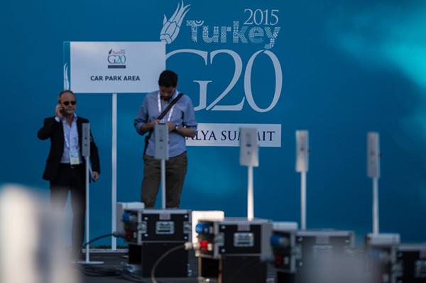 2015年11月14日 11月13日,在土耳其安塔利亞,記者在G20峰會媒體區(qū)工作。 新華社記者潘超越攝