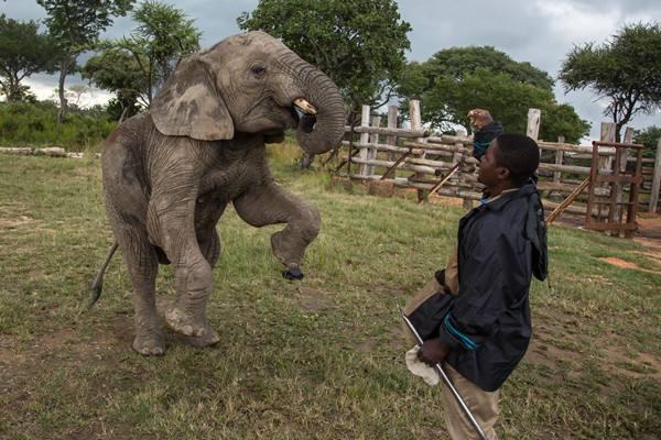 2015年4月7日,在距首都哈拉雷70公里的一座自然公園內(nèi),一只小象在飼養(yǎng)員的引導(dǎo)下嘗試靠后腿直立。(新華社記者許林貴攝)