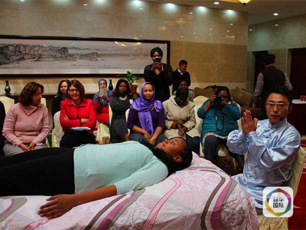 圖為中國援納米比亞醫(yī)療隊成員王鵬(前右)演示按摩手法。(新華社記者吳長偉攝)