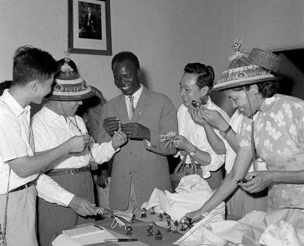 中非人民友好協(xié)會代表團(tuán)在1961年2月24日到6月19日的四個月中,訪問了幾內(nèi)亞、馬里、加納、尼日爾等八個西非國家。圖為非洲朋友向代表團(tuán)贈送禮品。(新華社記者孟憲全攝)