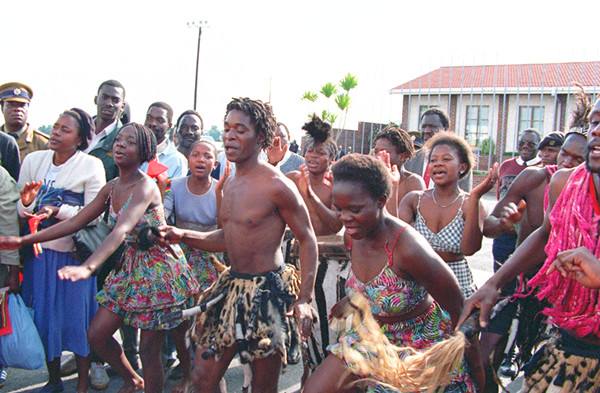 1996年5月22日,津巴布韋首都哈拉雷群眾載歌載舞,歡送中國國家主席江澤民。1996年5月8日至22日,時任中國國家主席江澤民對非洲六國進(jìn)行了友好訪問。(新華社記者王新慶攝)