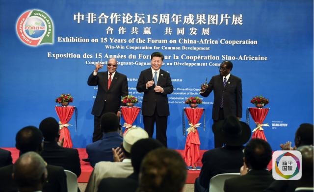 12月4日,國家主席習近平在約翰內斯堡出席中非合作論壇15周年成果圖片展開幕式,同南非總統(tǒng)祖馬,非盟輪值主席、津巴布韋總統(tǒng)穆加貝一道為展覽剪彩。(新華社記者謝環(huán)馳攝)