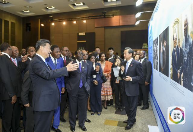 12月4日,國家主席習近平在約翰內斯堡出席中非合作論壇15周年成果圖片展開幕式,同南非總統(tǒng)祖馬,非盟輪值主席、津巴布韋總統(tǒng)穆加貝一道為展覽剪彩。這是習近平同非洲國家和地區(qū)組織領導人觀看展覽。(新華社記者謝環(huán)馳攝)