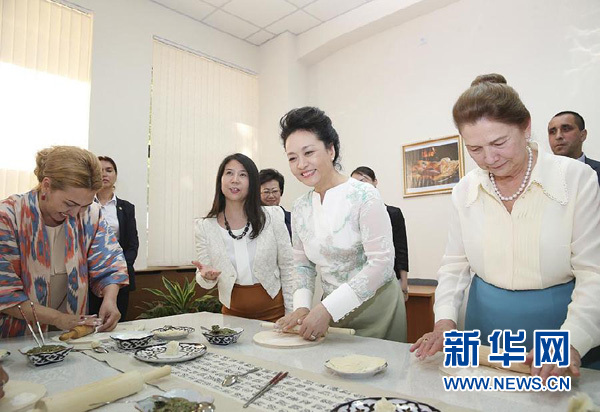 當(dāng)?shù)貢r(shí)間6月22日下午,國家主席習(xí)近平夫人彭麗媛同烏茲別克斯坦總統(tǒng)卡里莫夫夫人卡里莫娃共同參觀塔什干孔子學(xué)院。這是彭麗媛向?qū)W生們示范包餃子。新華社記者丁林?jǐn)z