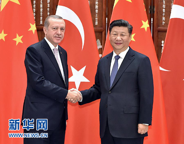 9月3日,國家主席習(xí)近平在杭州會見來華出席二十國集團領(lǐng)導(dǎo)人杭州峰會的土耳其總統(tǒng)埃爾多安。 新華社記者 李濤 攝