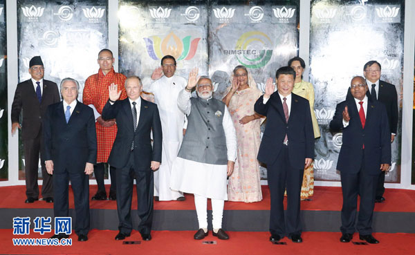 10月16日,金磚國家領(lǐng)導(dǎo)人同“環(huán)孟加拉灣多領(lǐng)域經(jīng)濟(jì)技術(shù)合作倡議”成員國領(lǐng)導(dǎo)人對(duì)話會(huì)在印度果阿舉行。國家主席習(xí)近平同印度總理莫迪、南非總統(tǒng)祖馬、巴西總統(tǒng)特梅爾、俄羅斯總統(tǒng)普京以及斯里蘭卡總統(tǒng)西里塞納、孟加拉國總理哈西娜、不丹首相托杰、尼泊爾總理普拉昌達(dá)、緬甸國務(wù)資政昂山素季、泰國政府代表等共同出席。這是與會(huì)領(lǐng)導(dǎo)人合影。新華社記者姚大偉攝