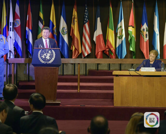 國家主席習近平在圣地亞哥聯(lián)合國拉丁美洲和加勒比經(jīng)濟委員會總部出席中拉媒體領(lǐng)袖峰會開幕式。智利總統(tǒng)巴切萊特陪同出席。在熱烈的掌聲中,習近平發(fā)表題為《開創(chuàng)中拉媒體合作新局面》的致辭。(新華社記者王曄攝)