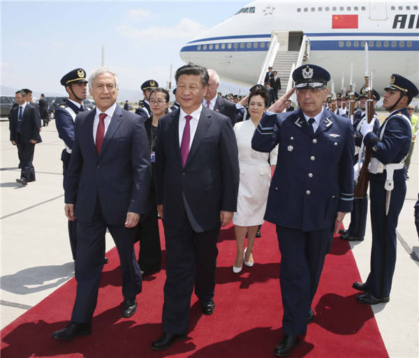 11月22日,國家主席習(xí)近平抵達(dá)圣地亞哥,對(duì)智利共和國進(jìn)行國事訪問。智利外長穆尼奧斯等在機(jī)場迎接習(xí)近平和夫人彭麗媛。(新華社記者 蘭紅光 攝)